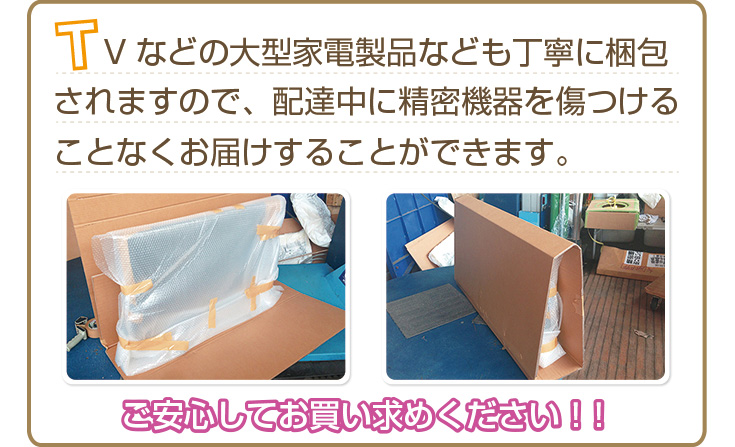 エコアースでは、お客様がご購入した商品を傷つけることなくお届けするために丁寧に梱包し、発送しております。 梱包作業を行うのは、ベテランのスタッフの手によって行われますので、小さなものから大きな家電のようなものまでご安心してお買い求めいただけます。 梱包の流れ 家具の梱包 サイズの大きいインテリア家具なども丁寧に梱包してます